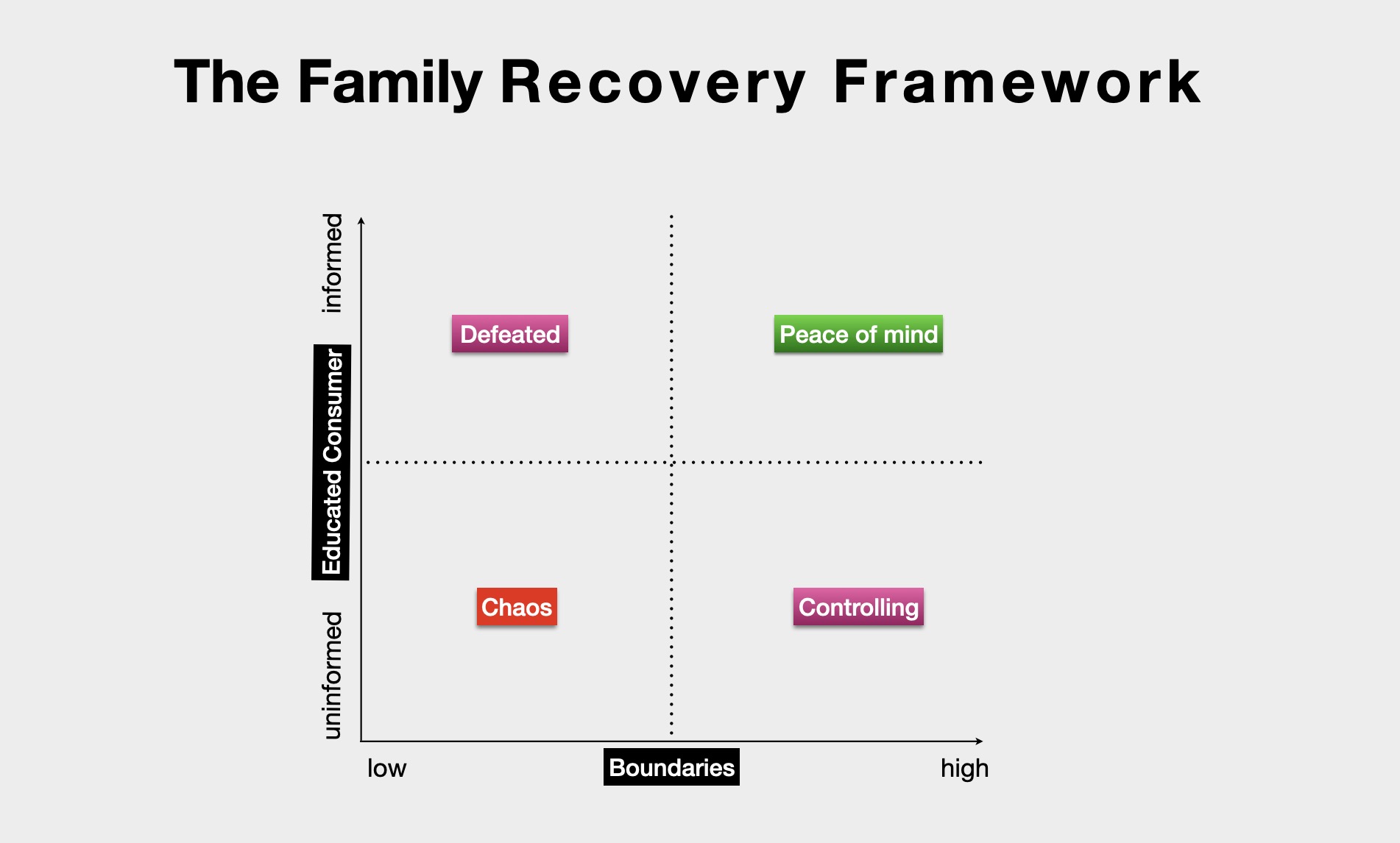 I have a presentation I call the Family Recovery Framework. It consists of four quadrants: Controlling, Defeated, Chaos, and Peace Of Mind. It effectively provides a roadmap for helping families identify where they are and how to get to the very attractive sounding Peace Of Mind quadrant.